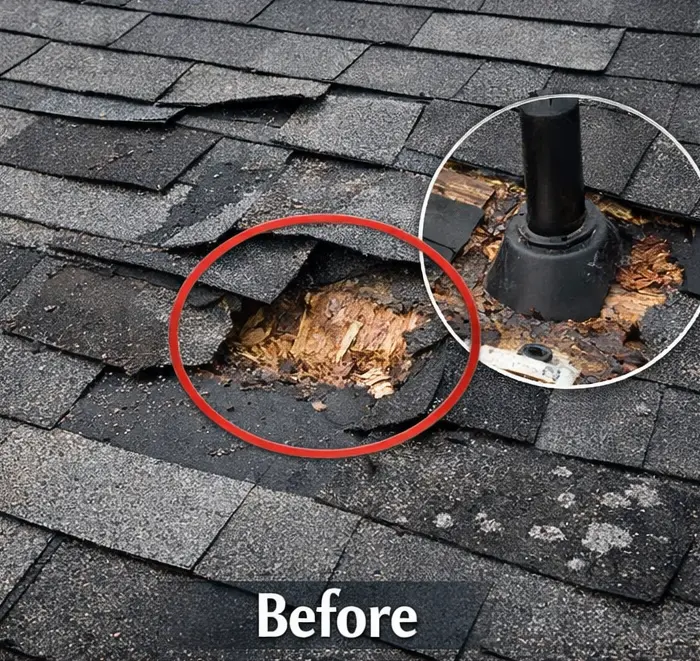 Many repairs start with damage that looks minor from the ground. Loose shingles, failing flashing, or worn seals often show their impact only after rain. The before and after results show how targeted repairs restore protection without replacing more than necessary.